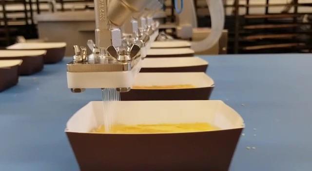 La Dosatrice per liquidi alimentari è integrabile alla linea di processo, e viene gestita con il software che la sincronizza con l'avanzamento ed il passo del nastro.