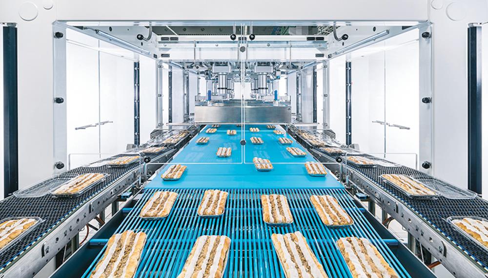 Linea per farcitura pomodoro e mozzarella su pizzette in teglia.